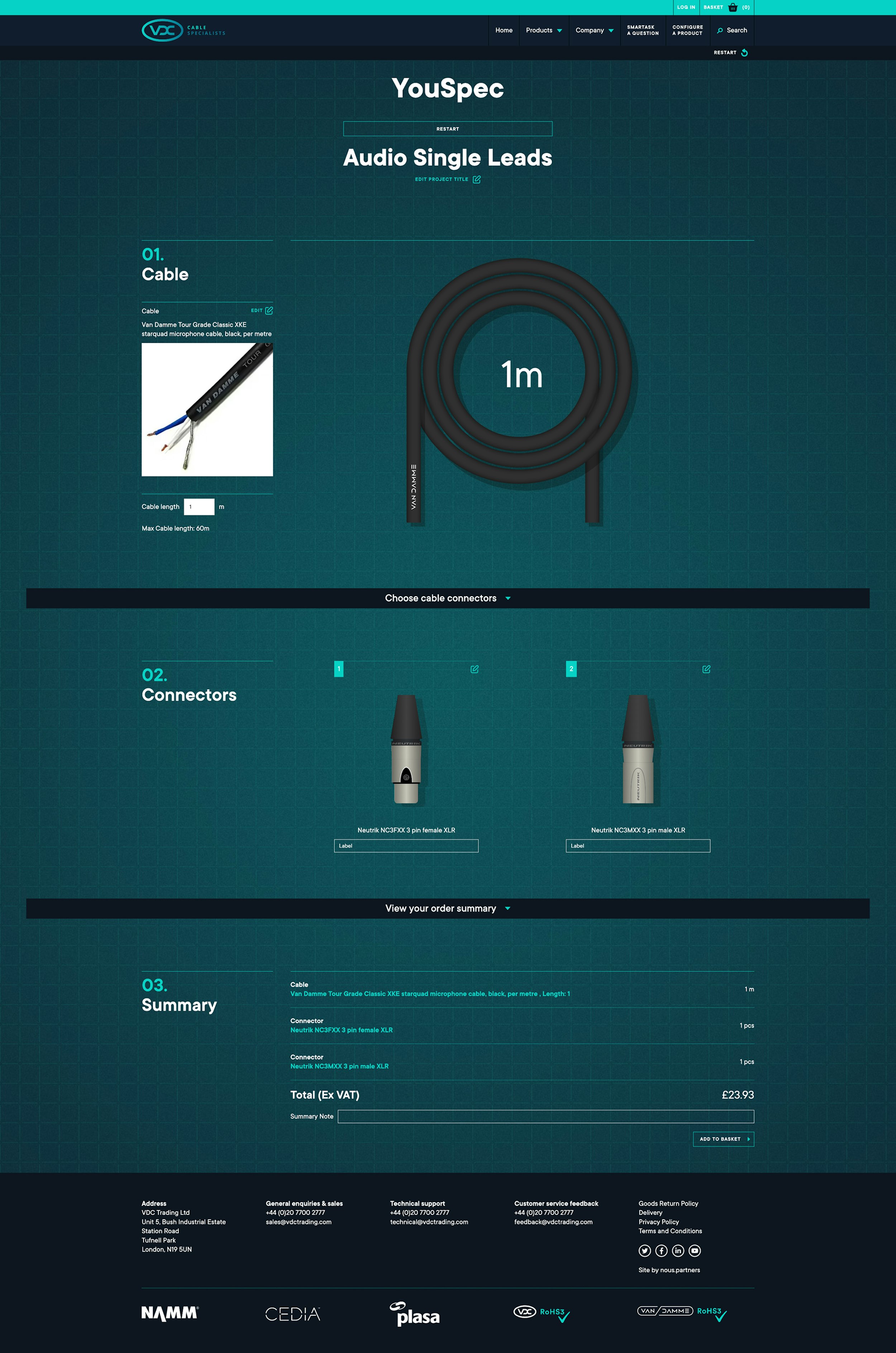 As part of a wider digital transformation roadmap, we designed and built YouSpec, an interactive product configurator tightly integrated with VDC’s ecommerce platform. Built using Laravel, the system allows customers to design, customise, and order complex cable assemblies online, guiding users through each stage of the build process. Real-time visuals and live pricing update dynamically as users design their product. Each configuration is validated against live product data and then submitted directly to the basket for checkout. Orders are synchronised with Sage via secure APIs, ensuring stock, pricing, and order data remain consistent across all systems. The user interface was designed with clarity and technical precision in mind — using a dark, grid-based layout that reflects the engineering nature of VDC’s products, while maintaining a clean, modern experience for users. Hosting is managed on AWS with Laravel Forge, providing performance, reliability, and scalability.